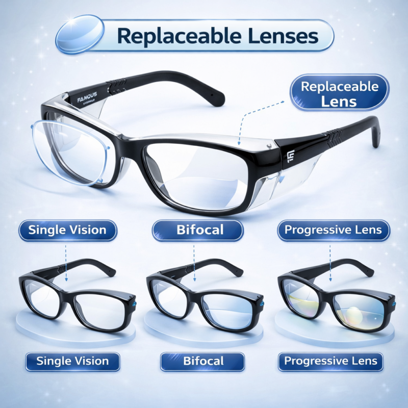 The ergonomic design ensures a secure and comfortable fit, while the clear side shields provide additional protection against dust, debris, and flying particles. Prescription safety glasses frame supports single vision, bifocal, and progressive prescription lenses you can change lenses as per your prescription eye power making it suitable for a wide range of industrial and professional applications.Stylish yet durable safety glasses for women, offering protection with comfortable frames and prescription lens options.