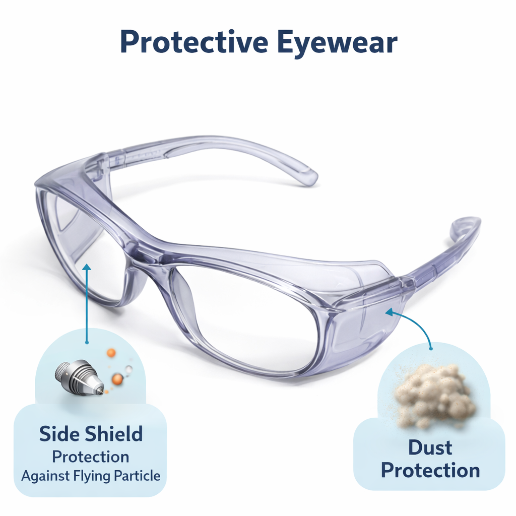 Industrial-grade prescription safety frame with side shield protection, developed to reduce exposure to dust, debris, and mechanical hazards.