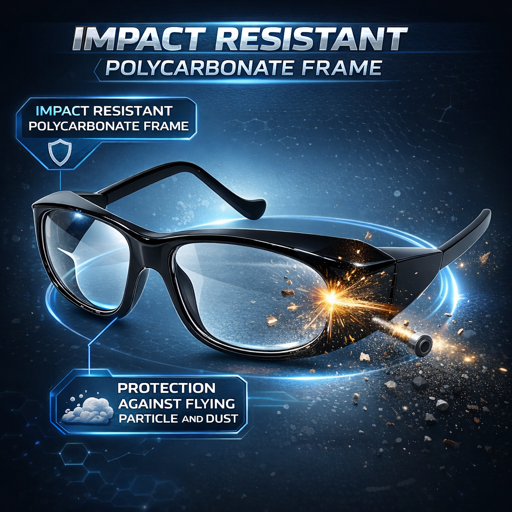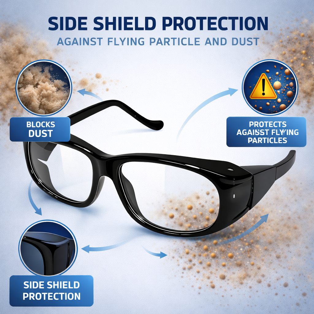 The ergonomic design ensures a secure and comfortable fit, while the clear side shields provide additional protection against dust, debris, and flying particles. Safety eyewear frame supports single vision, bifocal, and progressive prescription lenses,you can change lenses as per your prescription eye power making it suitable for a wide range of industrial and professional applications.